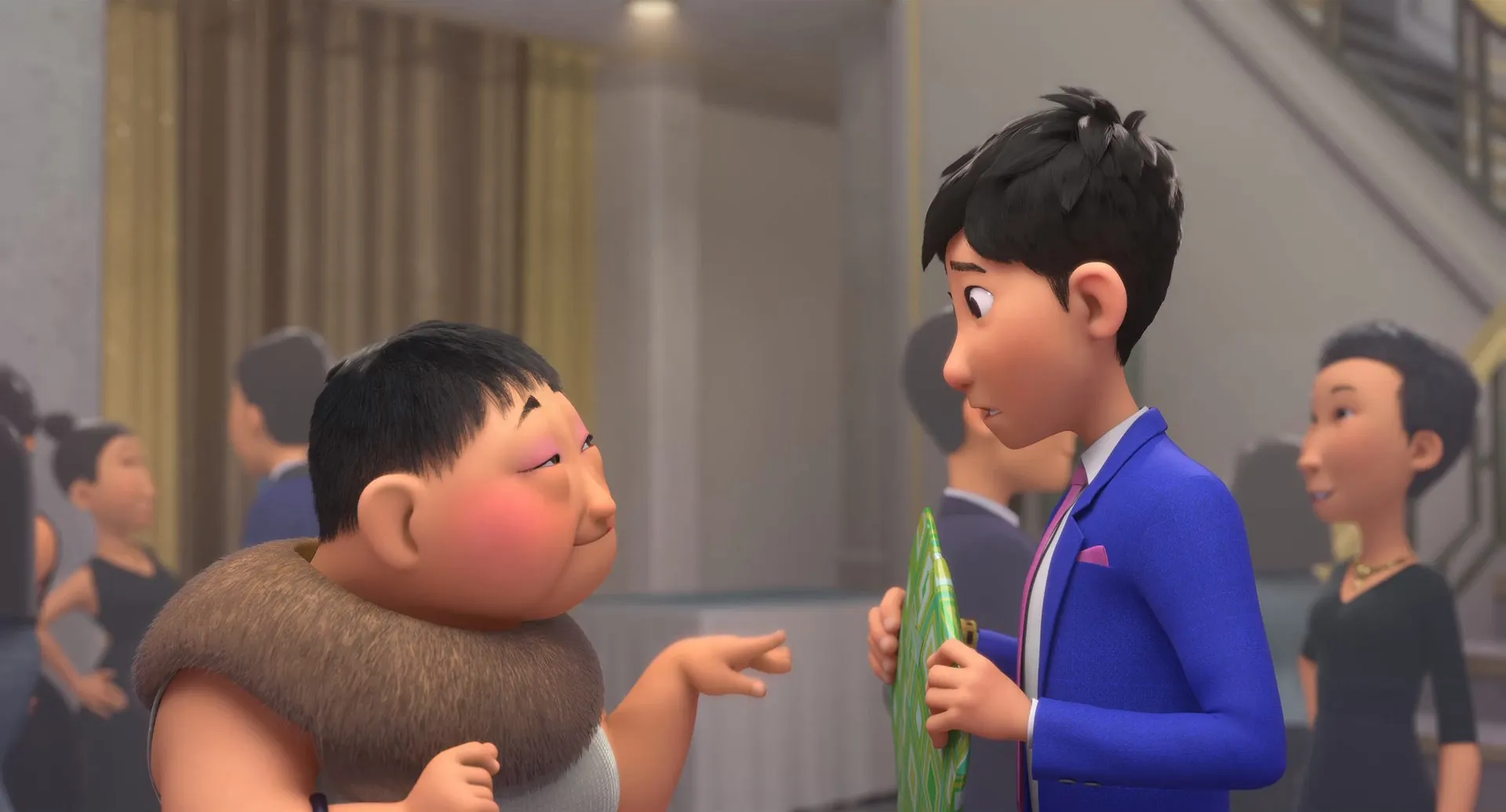 Cast: Jimmy Wong as Din (voice), John Cho as Long (voice), Constance Wu as Mom (voice), Natasha Liu Bordizzo as Lina (voice), Jimmy O. Yang as Short Goon / Security Guard 2 (voice), Aaron Yoo as Pockets (voice), Will Yun Lee as Dad (voice), Bobby Lee as Tall Goon (voice), Nico Santos as Buckley (voice), Ronny Chieng as Pipa God (voice), Ian Chen as Young Din (voice), Sumalee Montano as Granny Neighbor / Cougar / Party Guest (voice), David So as Construction Worker / Neighbor (voice), Gustav Lindquist as Security Guard 1 & 3 / School Bully (voice), Alexandre Chen as Various characters (voice), Alyssa Abiera as Young Li Na (voice), Gabriel Lee as Wen / DJ / K-Drama Man (voice), Chris Appelhans as Hot Towel Waiter / Nomani Retailer (voice), Rad Sechrist as Maitre D' / Additional Waiter (voice), Cathy Cavadini as Additional Voices (voice), Levi Nunez as Additional Voices (voice), Nora Wyman as Additional Voices (voice), Jeremy Maxwell as Additional Voices (voice), Lee Chen as Additional Voices (voice), James Taku Leung as Additional Voices (voice), Constance Parng as Additional Voices (voice), Malana Lea as Additional Voices (voice), Victor Chi as Additional Voices (voice), Elizabeth Pan as Additional Voices (voice), Paul Kwo as Additional Voices (voice), Kathy Wu as Additional Voices (voice), Wilky Lau as Additional Voices (voice), Willow Geer as Additional Voices (voice), Will Collyer as Additional Voices (voice), Regina Taufen as Additional Voices (voice), David Arnott as Additional Voices (voice), Simon Twu as Additional Voices (voice)
